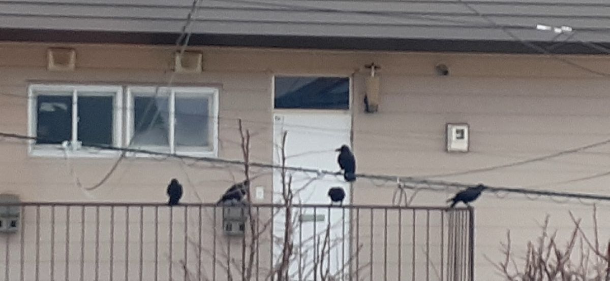 いつも向かいのアパートの手すりに番で止まってる烏も今日は沢山来て~~何羽でカァ~カァ~と鳴いてるのが